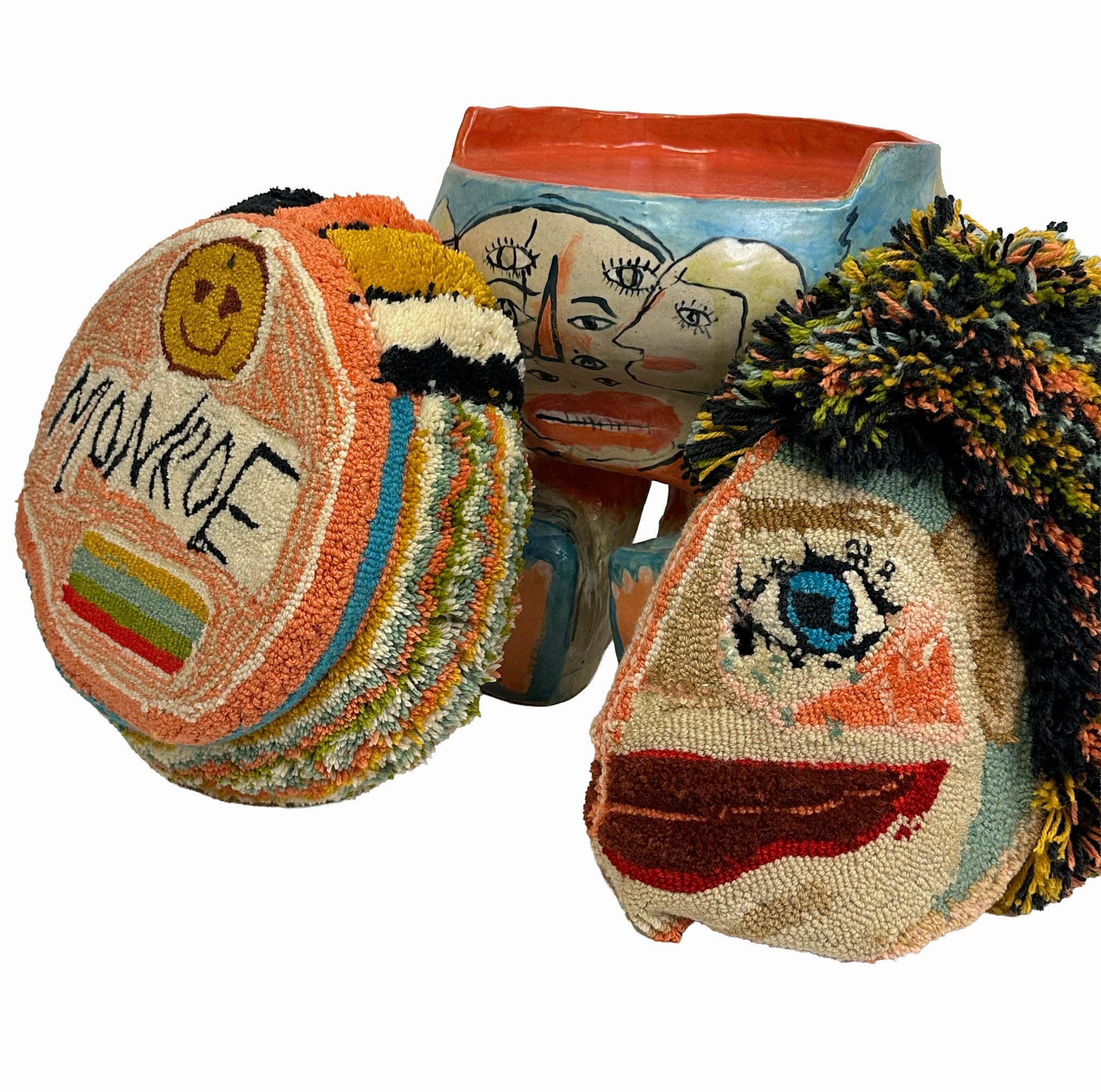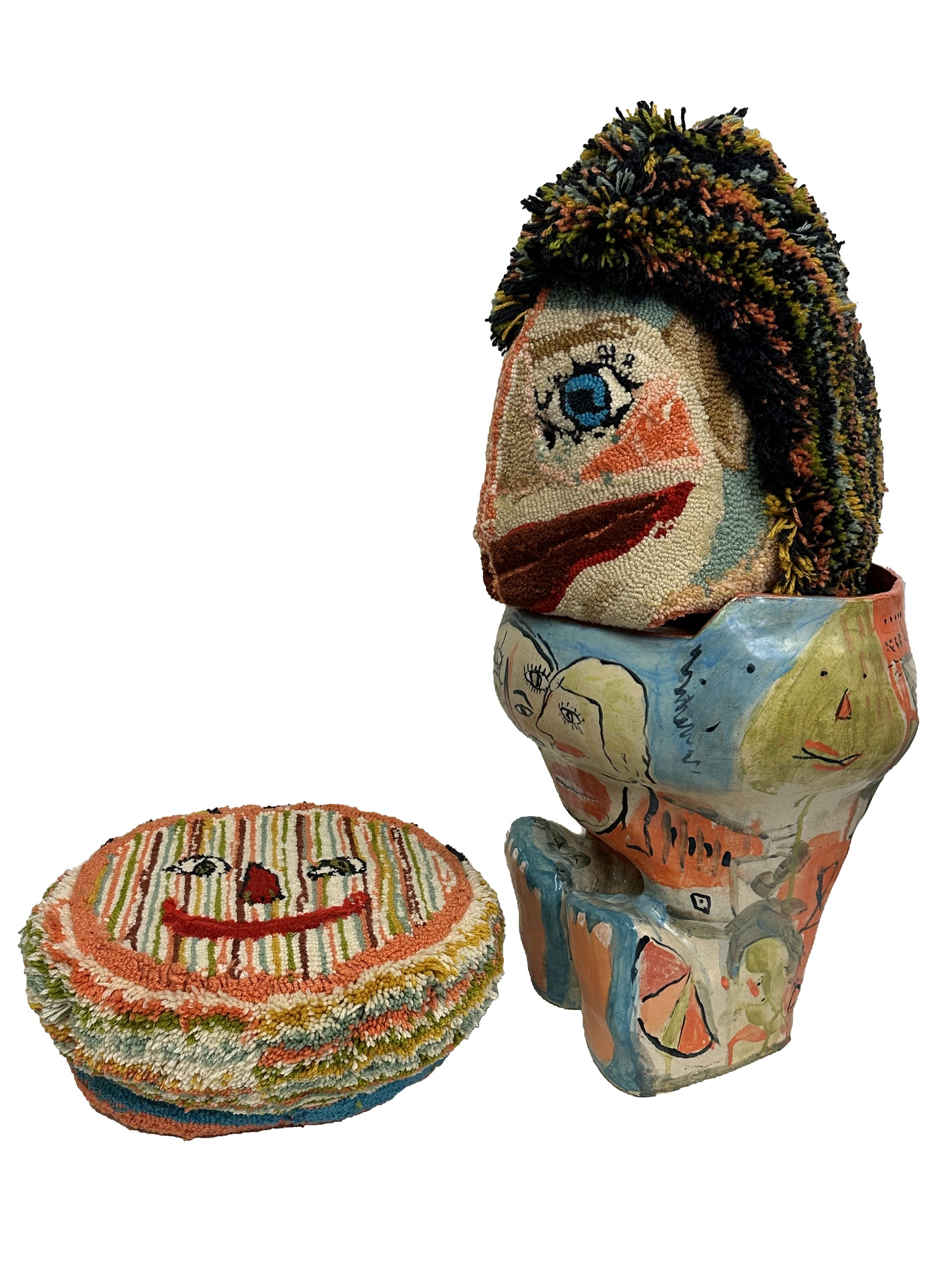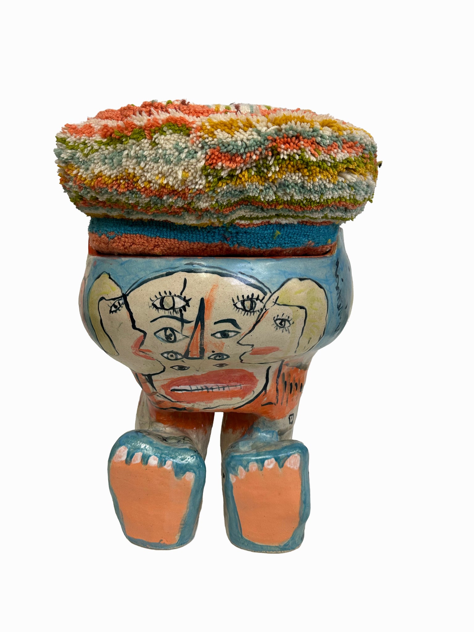 hand built ceramic glazed stool, tufted wool hand sewn mask and cushion