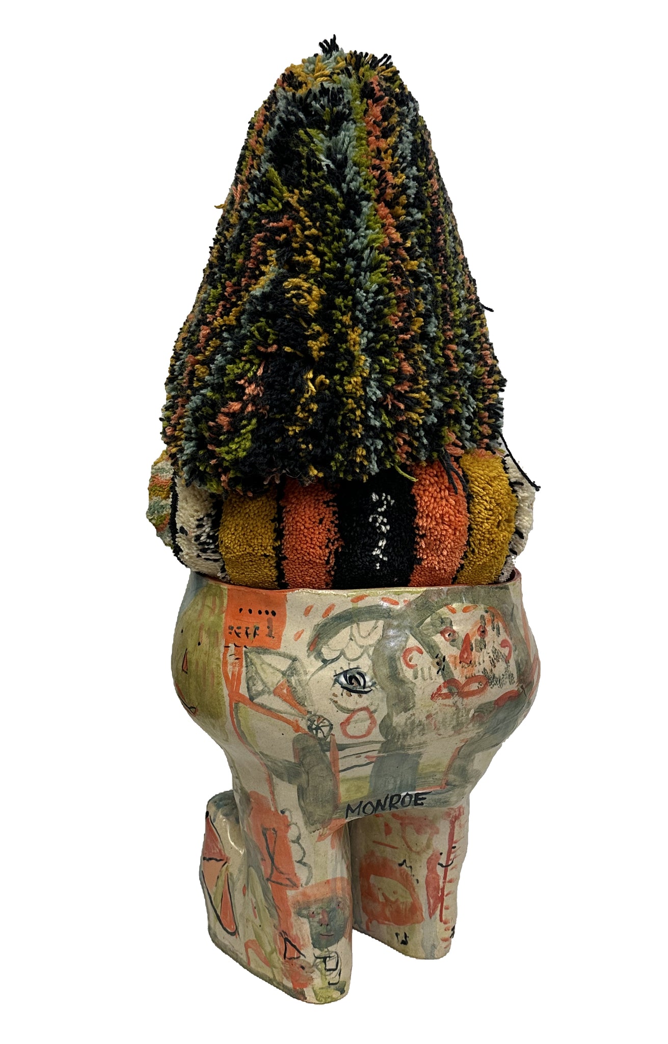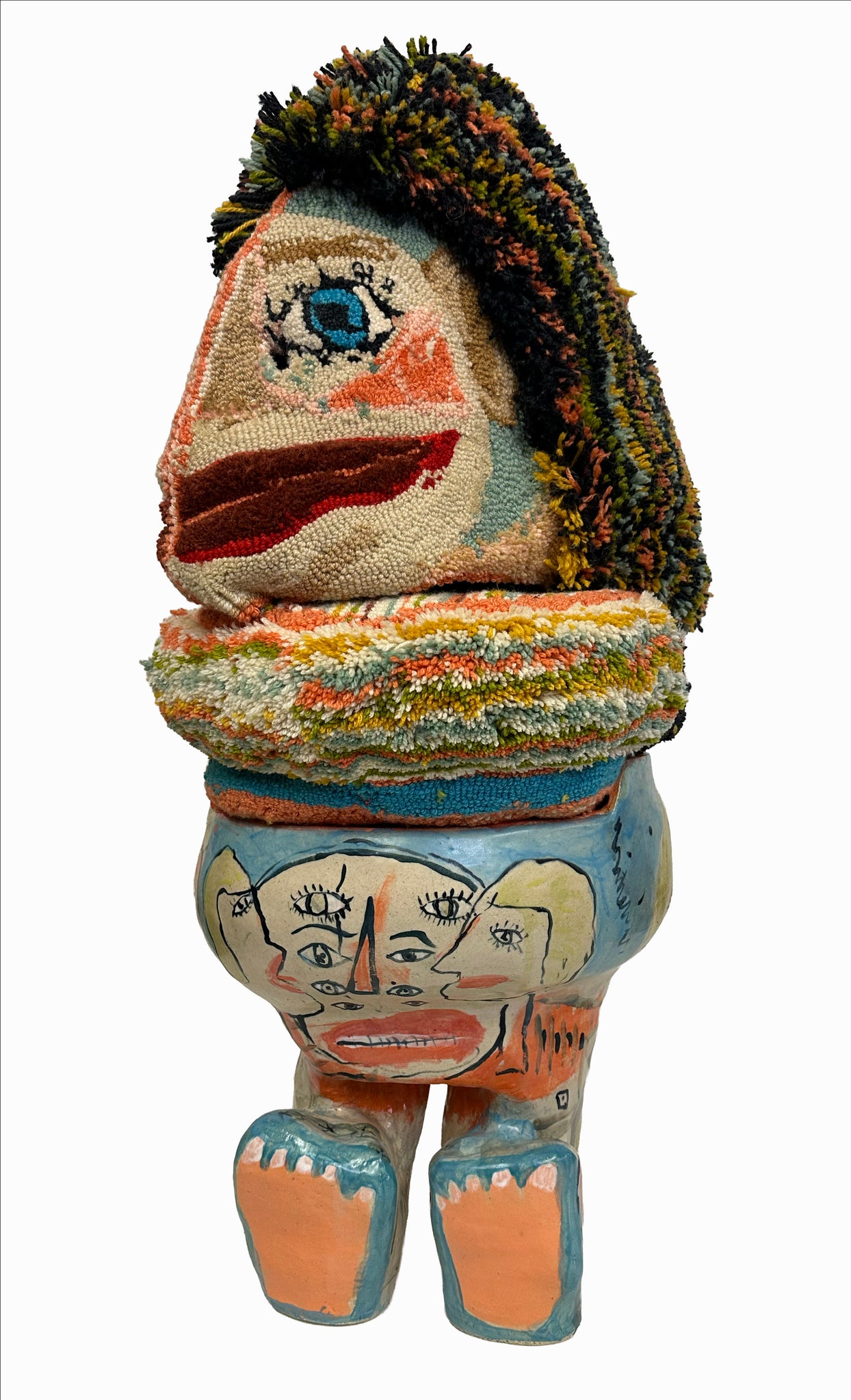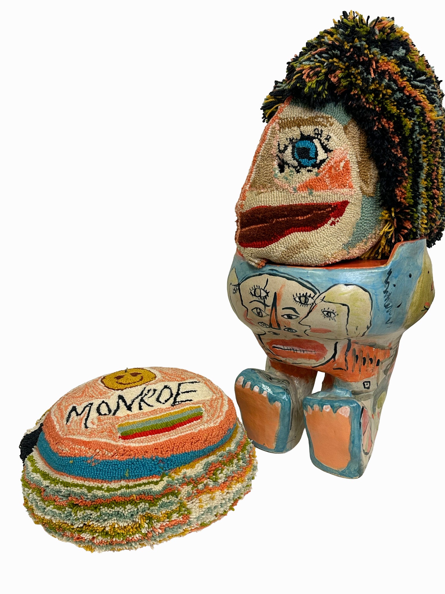 hand built ceramic glazed stool, tufted wool hand sewn mask and cushion