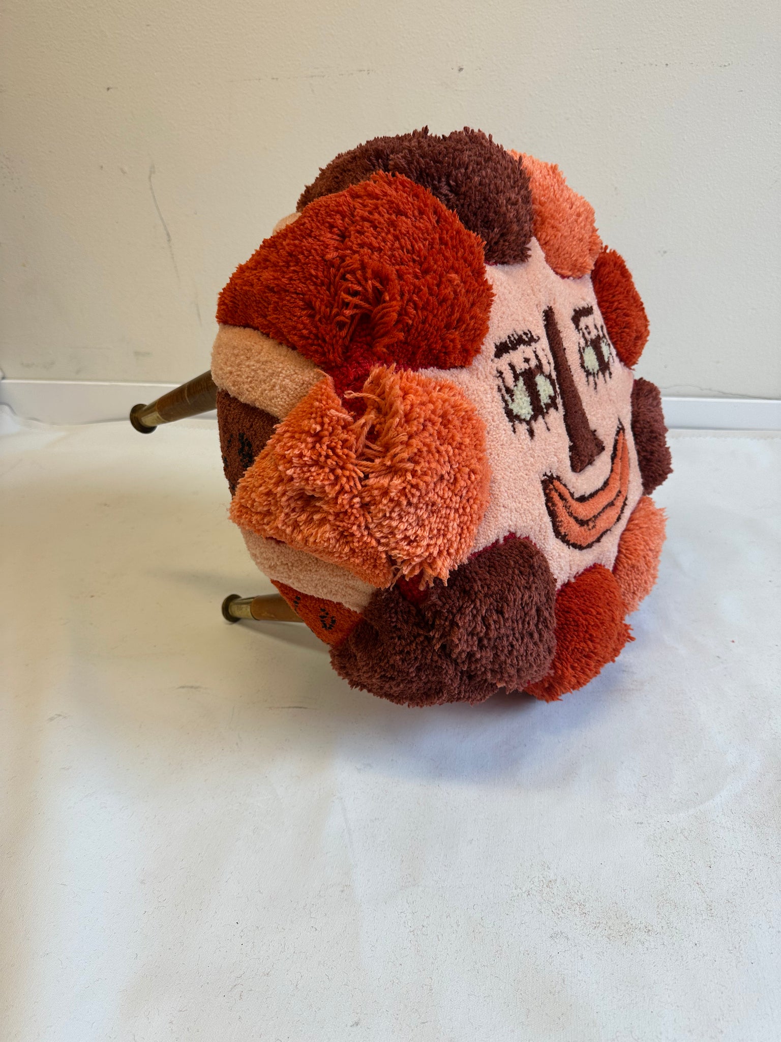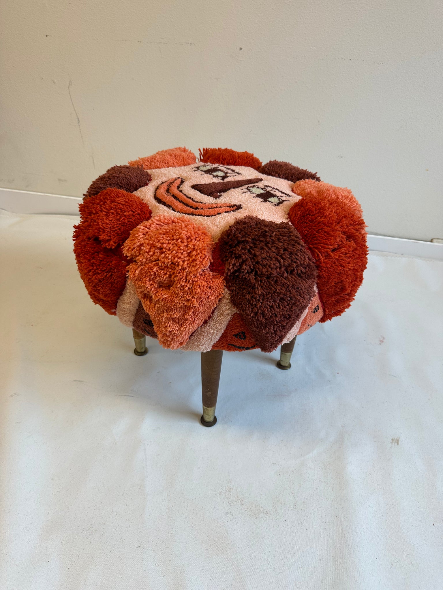 100% wool hand sewn and tufted, upholstered on foot stool, vintage legs